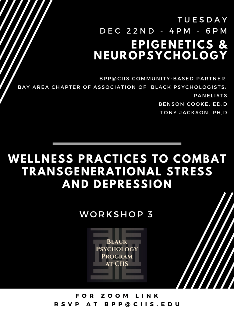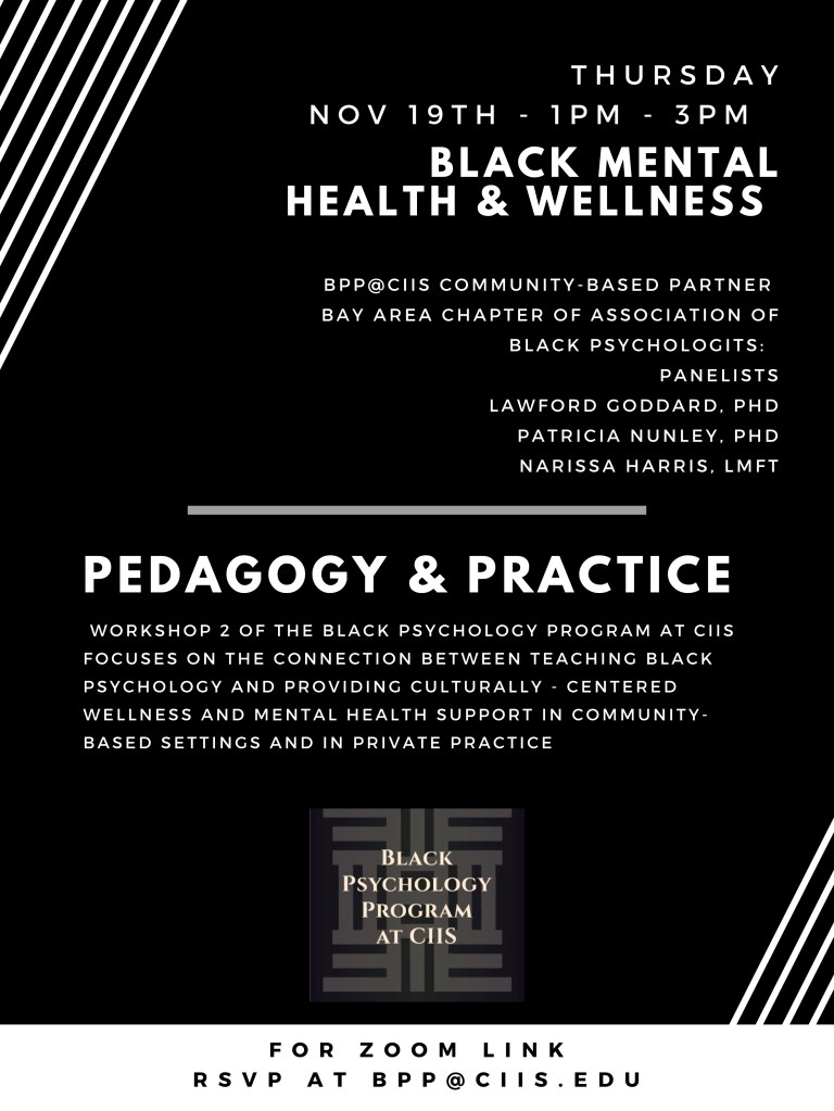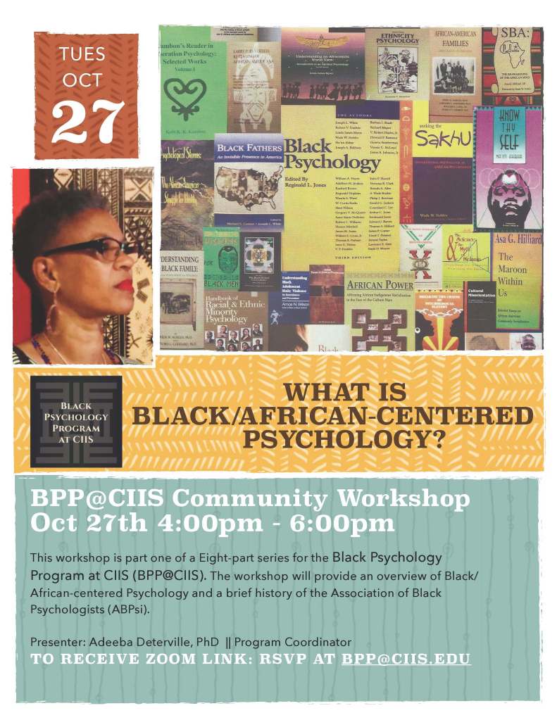 The Black Psychology Program at CIIS (BPP@CIIS) Explore Black Psychology and other African-Centered wellness practices, both from a professional context as well as an informal, community-based context. The intention of the BPP@CIIS workshop series is to strengthen the social and educational foundations and provide support for the idea of Black individuals entering mental health careers.